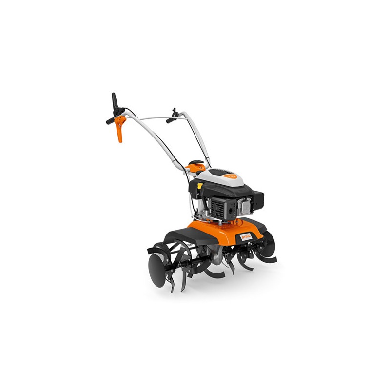Fast, robust and effective, the STIHL MH (HB) 685 power tiller can be used for a variety of soil types and terrain types. This is ensured by anti-vibration elements between the gearbox housing and the handlebar and the sophisticated weight distribution of the tiller. For a high level of comfort, the height and width of the bar are adjustable to the user. For storage, it can be folded up. The device runs forwards or backwards and thanks to the brake spur it can work perfectly. The working width can be adjusted from 85 cm to 60 cm on request, in order to order more narrowly planted crops. A sturdy gearbox made of aluminium, the worm shaft made of hardened steel and the worm wheel made of a bronze alloy ensure a long service life. The rear pair of wheels is folded up while working and comes for transporting or storing the MH 685..