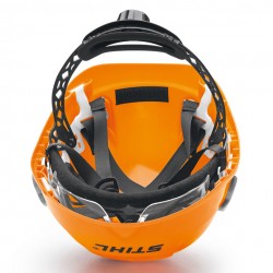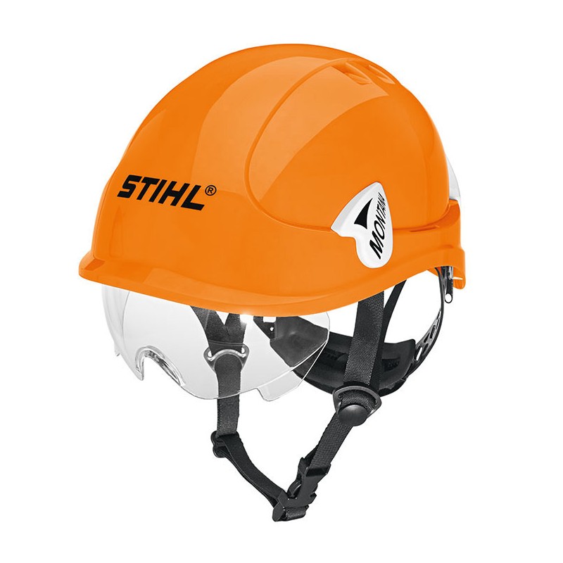 Particularly light safety helmet made of polycarbonate for working in trees and on the ground. Integrated retractable safety glasses, integrated hearing protectors with cord, 4-point chin strap, 6-point inner fittings, headband adjustable by ratchet, reflective sticker. The safety glasses are tested to EN 166, ear plugs to EN 352 and helmet to EN 397.