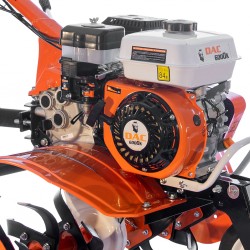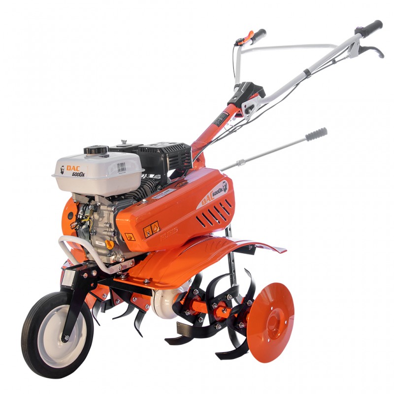 Powerful, handy and reliable, with a 4-stroke General Engine, the gearbox with three gears (two forward and one reverse), the possibility to attach various accessories for other types of works. Ruris DAC 6000K tillers allow the attachment of accessories such as: one-furrow plough, ditcher or potato plough, metallic or rubber wheels or a tow which supports a load up to 500kg.