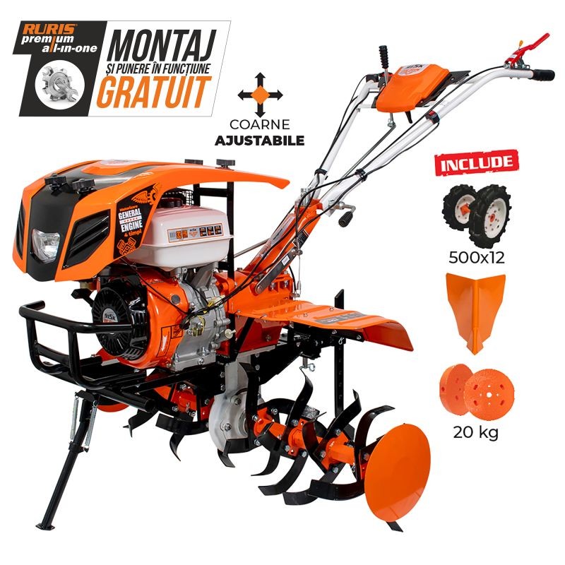Ruris 915ACC tiller is ideal for the households that have to process areas over 10.000 square meters. Equipped with a 15 HP General Engine and blades for digging with an adjustable width between 750 mm and 1110 mm, RURIS 915ACC tiller can easily dig any type of soil, irrespective of its hardness reaching depths up to 36 cm with an efficiency over 1200 sqm/h.