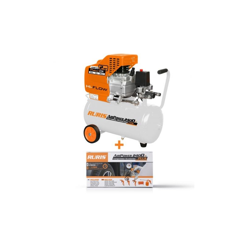 The RURIS Air Power 2400 air compressor is built for garage, garden and workshop usage. Has two air outlet circuits, with independent pressure monitoring and pressure rate regulating valve. The accessories kit includes: air blow gun, liquid spray gun, washing gun, inflating gun, spiral hose.