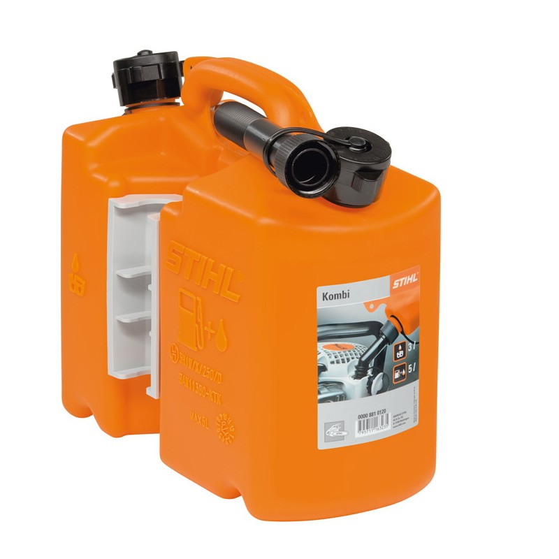 Canistra pt produs petrolier cu doua compartimente separate (5l + 3l) si mecanism de umplere inclus. Ideala pt depozitarea separata a uleiului de lant si a benzinei amestec cu ulei 2T pt motoferastraie.