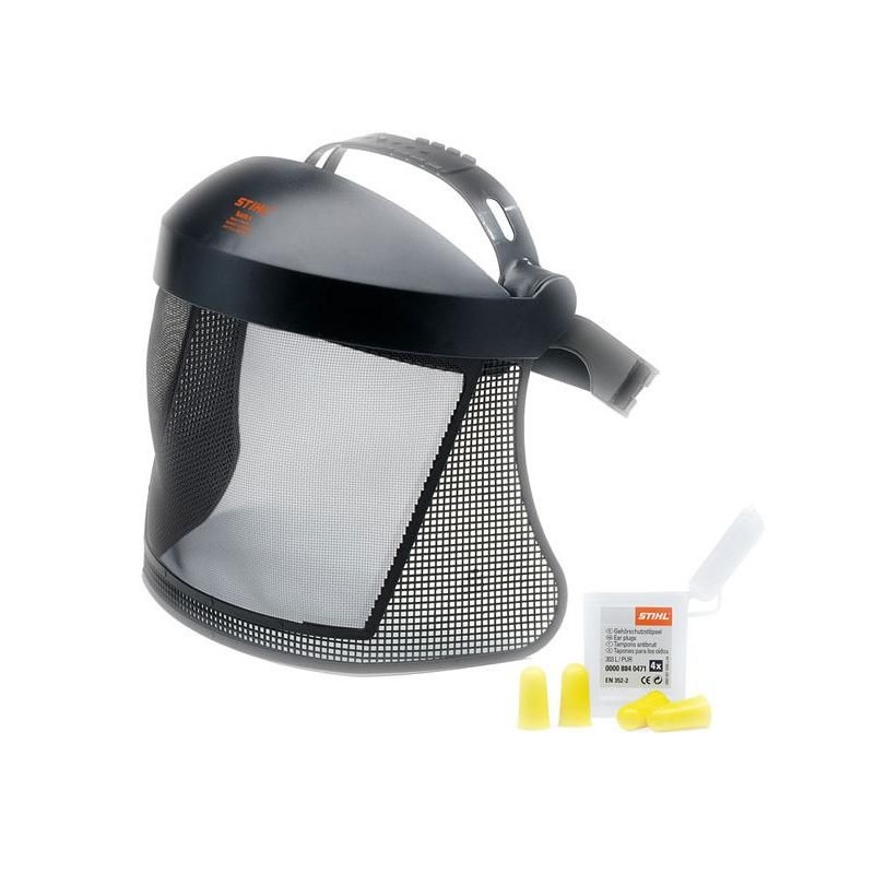Cu bandă dublă pentru a sprijini partea din spate a apărătorilor capului și urechii. Cu viziera din plasa marita si protectie suplimentara pentru frunte. Îndeplinește SNR 30, EN 352 și EN 166.
