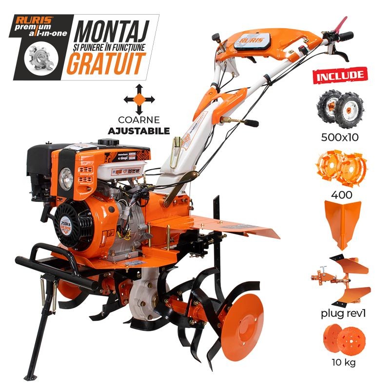 Se livreaza cu: freze de pamant, roti cauciuc 400-8 + plug de bilonat + plug reversibil rev1 + roti metalice 400 fara manicot + set contragreutati
