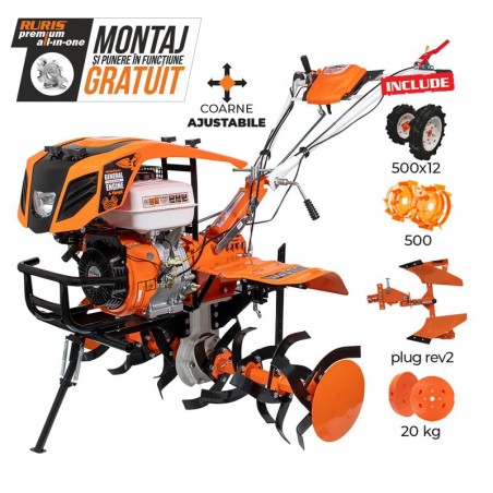 Se livreaza cu: freze de pamant, roti cauciuc 5.00-12+ plug reversibil rev2 + roti metalice 500mm + set contragreutati.