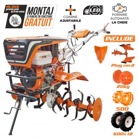 Se livreaza cu: freze de pamant, roti cauciuc 6.00-12 + rarita + plug reversibil rev2 + roti metalice 500 + set contragreutati