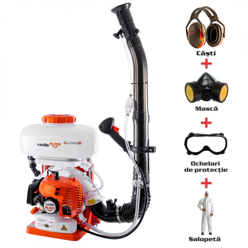 Motorizare de 3 CP cu consum redus de carburant, pompa Booster pt stropire pe verticala pana la 10m, rezervor cu o capacitate de 14 litri, atât pentru substanțe lichide, cât și granulate. Pentru o pulverizare foarte fină, atomizorul dispune de un kit format dintr-un filtru de lichide și o diuză injector, care ajută la dispersia optimă. Pentru o utilizare cât mai simplă, RURIS A109S vine cu un mâner ergonomic, multifuncțional, pe care se află comenzile START/STOP, dar și o clapetă care permite reglarea accelerației, fără să fie nevoie de apăsare constantă a acestuia. Atomizorul RURIS A109S vine cu bretele căptușite și spate capitonat, care susțin perfect greutatea aparatului.